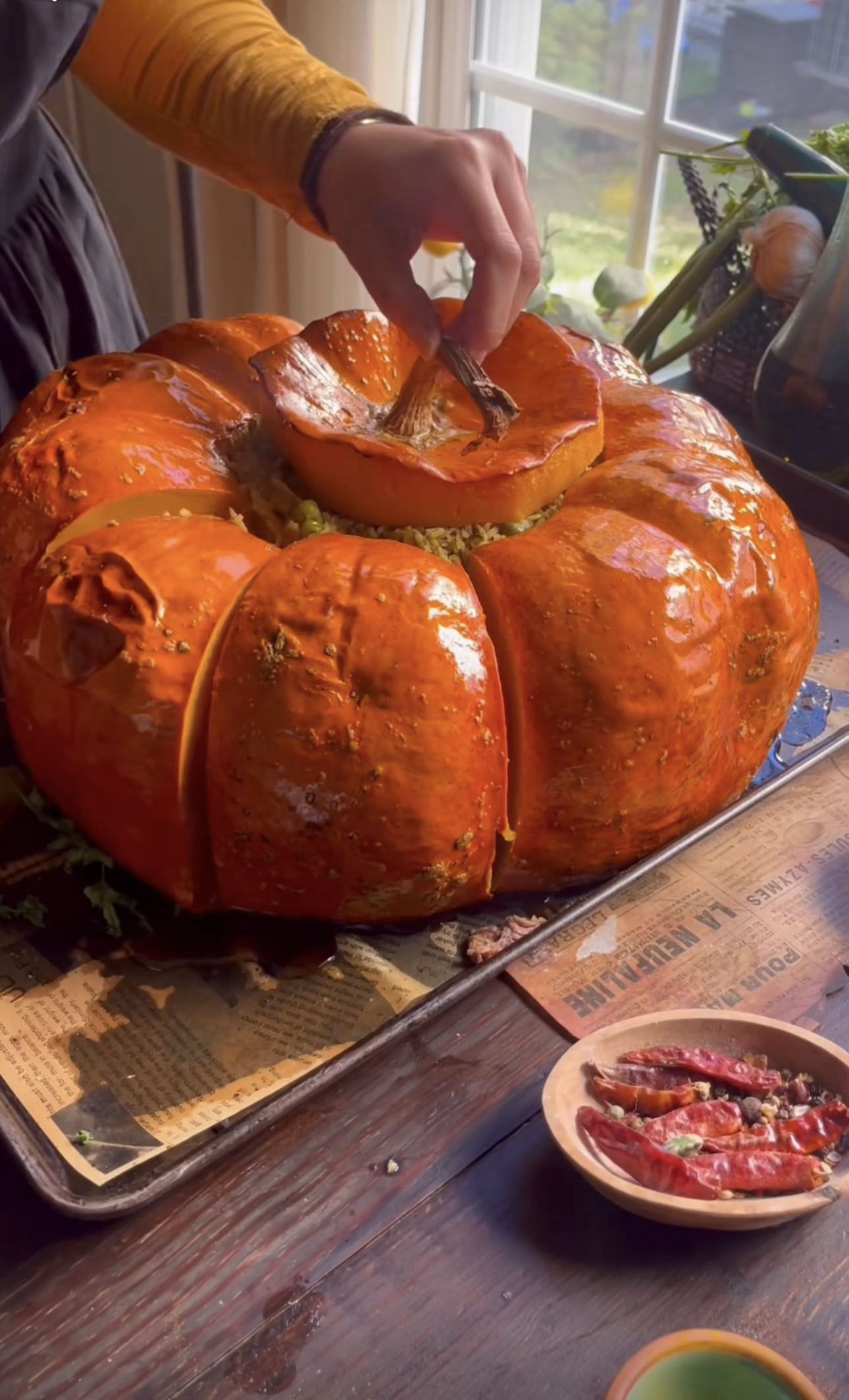 - Transfer the stuffed pumpkin to a baking dish and place it in the preheated oven.
